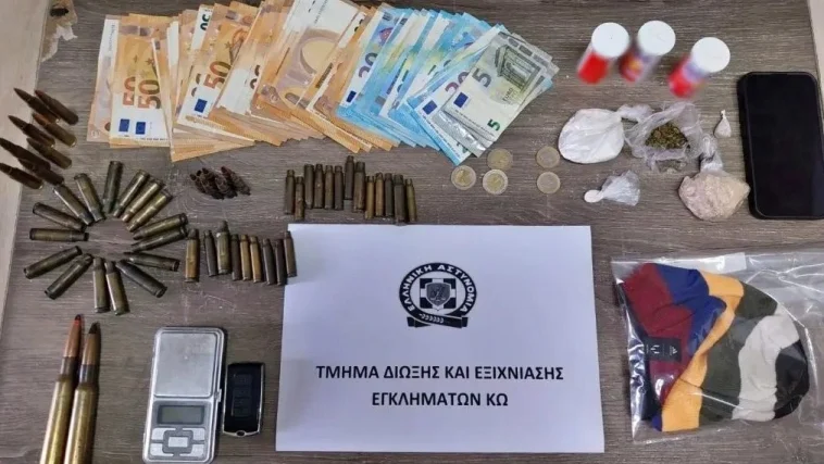 Στην κατοχή του βρέθηκαν και κατασχέθηκαν από αστυνομικούς του Τμήματος Δίωξης και Εξιχνίασης Εγκλημάτων Κω μεταξύ άλλων 30 γραμμάρια κοκαΐνης, 35- γραμμ. MDMA, 38 κάλυκες και 3 φυσίγγια στρατιωτικού όπλου.
