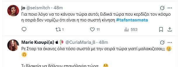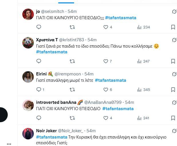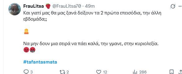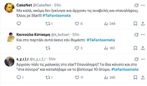 «Να’το το πρώτο φάουλ; Απαράδεκτοι!», «Άρχισαν πάλι τις μαλακίες στο star? Επανάληψη? Τα ίδια κάνατε και στο “στα σύνορα” και καταλήξαμε να το βλέπουμε 10 άτομα», «Καλά επανάληψη από το δεύτερο επεισόδιο; Ασέβεια στους τηλεθεατές», «Γιατί επανάληψη τόσο σύντομα;;«Άρχισες τις μαλ@κιες το Star. Ντροπή ρε”.