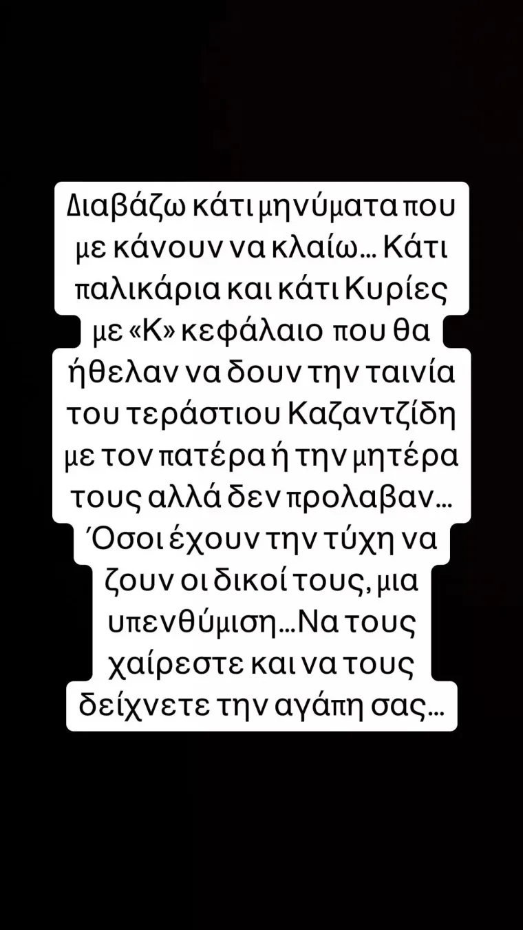 «Διαβάζω μηνύματα που με κάνουν να κλαίω. Κάτι παλικάρια και κάτι Κυρίες με «Κ» κεφαλαίο που θα ήθελαν να δουν την ταινία του τεράστιου Καζαντζίδη με τον πατέρα ή τη μητέρα τους αλλά δεν πρόλαβαν. Όσοι έχουν την τύχη να ζουν οι δικοί τους, να τους χαίρεστε και να τους δείχνετε την αγάπη σας», έγραψε χαρακτηριστικά ο τραγουδιστής.