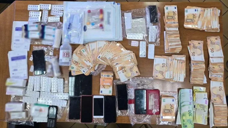 63.615 ευρώ, πλήθος εγγράφων με χειρόγραφες σημειώσεις, φαρμακευτικά σκευάσματα (χάπια άνευ ιατρικών συνταγών),αναλώσιμα είδη νοσηλείας ασθενών (γάζες, επιθέματα κλπ), κινητά τηλέφωνα, ένας ηλεκτρονικός υπολογιστής και ατζέντες με χειρόγραφες σημειώσεις.