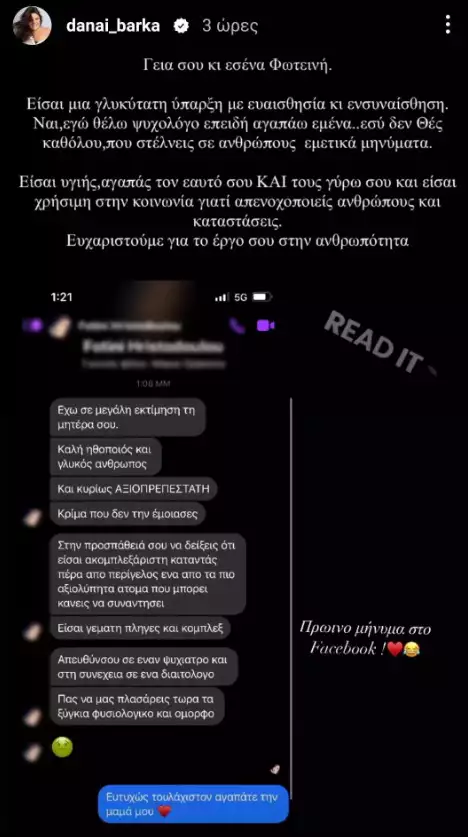«Φωτεινή, είσαι μια γλυκύτατη ύπαρξη με ευαισθησία και ενσυναίσθηση. Ναι, εγώ θέλω ψυχολόγο, επειδή αγαπάω εμένα… εσύ δεν θες καθόλου που στέλνεις σε ανθρώπους εμετικά μηνύματα.