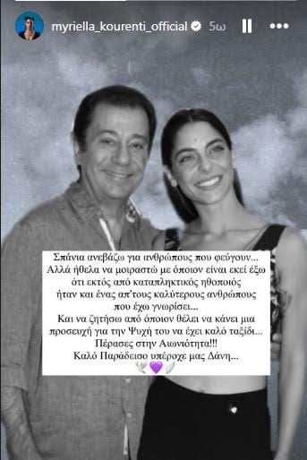 Με μια κοινή τους φωτογραφία και ένα τρυφερό κείμενο η Μυριέλλα Κουρεντή αποχαιρετά δημόσια τον Δάνη Κατρανίδη και ζητά από όσους τη διαβάζουν να κάνουν μια προσευχή για τον ηθοποιό «Σπάνια ανεβάζω κάτι για ανθρώπους που φεύγουν αλλά ήθελα να μοιραστώ με όποιον είναι εκεί έξω ότι εκτός από καταπληκτικός ηθοποιός ήταν και ένας από τους καλύτερους ανθρώπους που έχω γνωρίσει. Και να ζητήσω από ποιον θέλει να κάνει μια προσευχή για την ψυχή του να έχει καλό ταξίδι. Πέρασες στην αιωνιότητα. Καλό παράδεισο υπέροχε μας Δανη» γράφει.