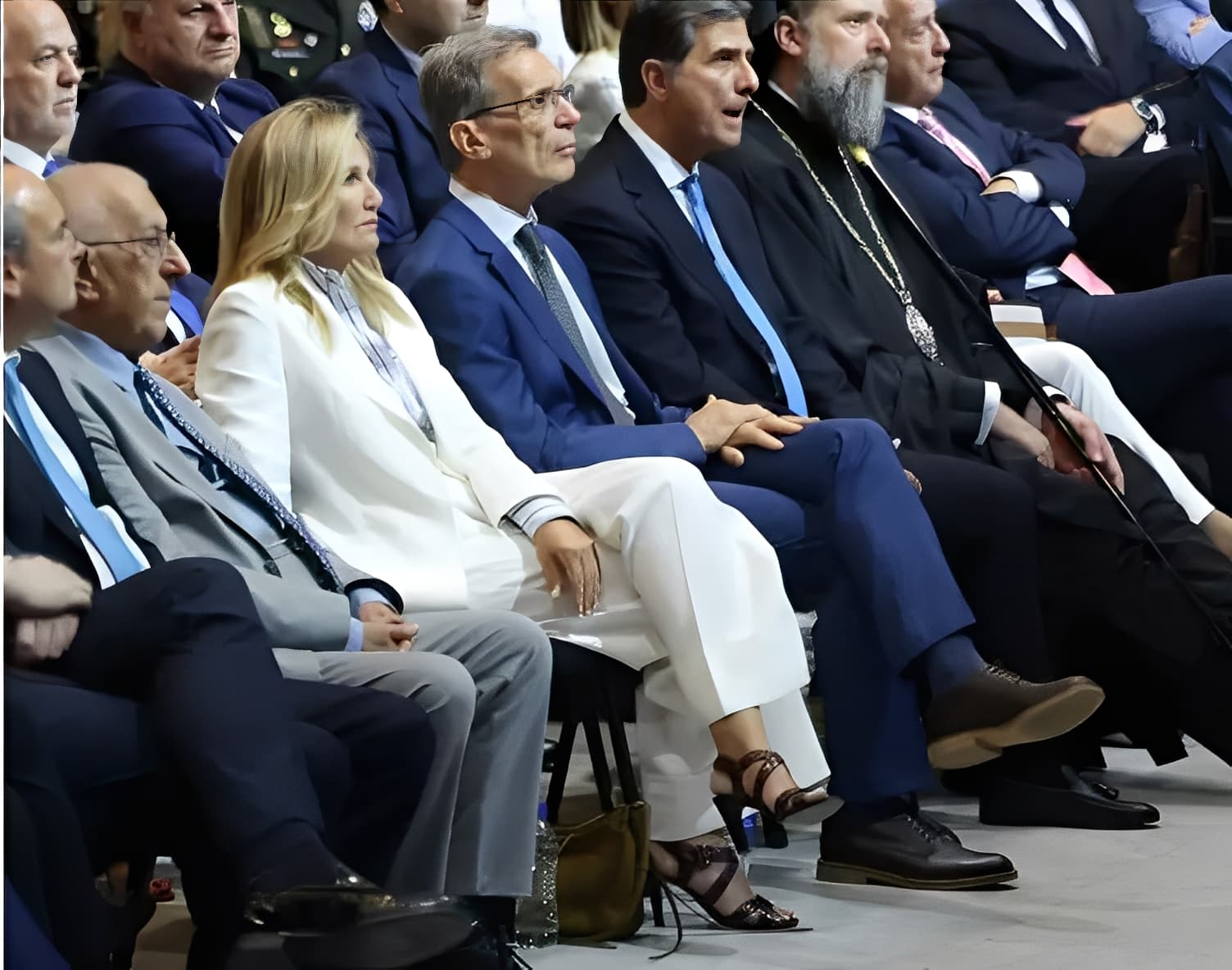 Για την περίσταση, επέλεξε να φορέσει ένα ολόλευκο κοστούμι, επιβεβαιώνοντας τόσο την κομψότητά της όσο και την αποφασιστικότητά της ως δημόσιο πρόσωπο. Το λευκό κοστούμι έδωσε μια δυναμική, σχεδόν μονοχρωματική αισθητική, που τράβηξε το βλέμμα και ενίσχυσε την εικόνα της στήριξης και της παρουσίας δίπλα στον πρωθυπουργό.