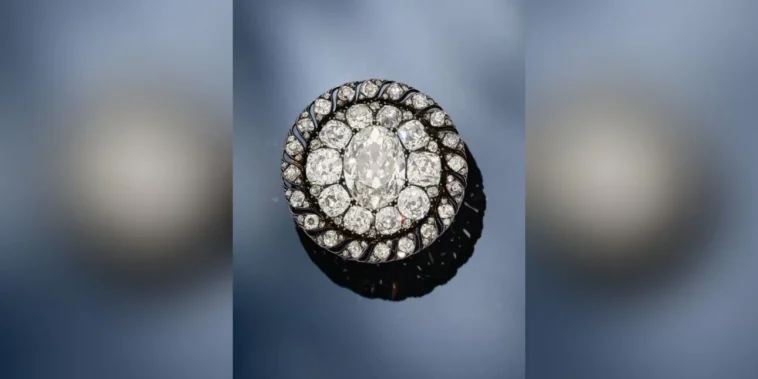 - Στην καρφίτσα, διαμέτρου περίπου 45 χιλιοστών, δεσπόζει ένα μεγάλο οβάλ διαμάντι 13,04 καρατίων που είναι πλαισιωμένο από σχεδόν 100 μικρότερα διαμάντια διαφόρων σχημάτων και μεγεθών.