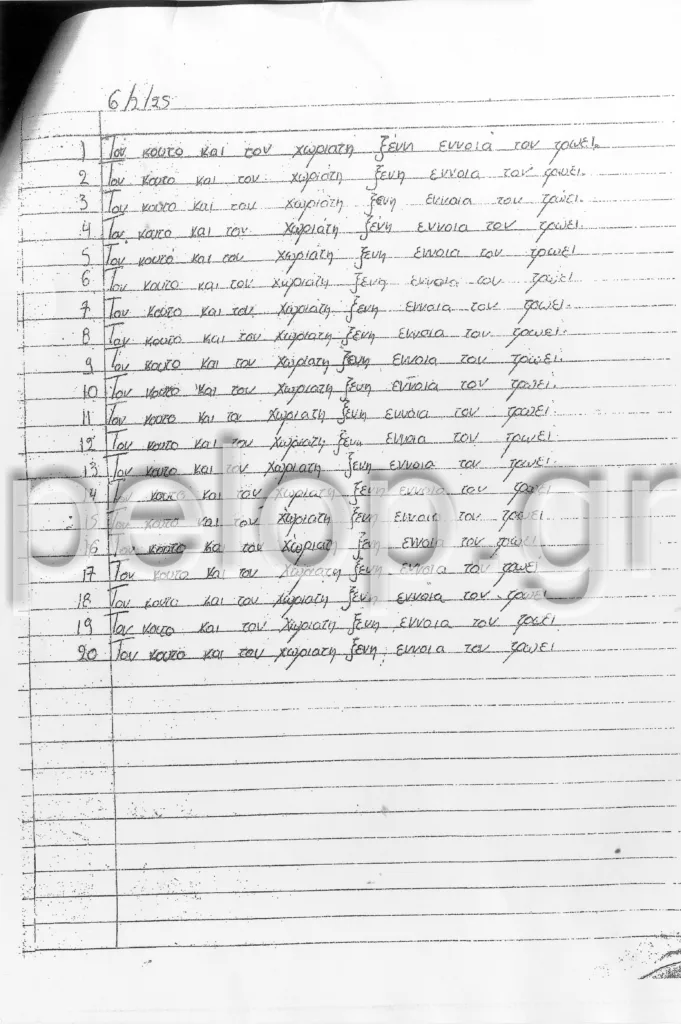 Στην καταγγελία του Συλλόγου Γονέων και Κηδεμόνων αναφέρεται μεταξύ πολλών άλλων ότι: «Η κ… κάνει καθημερινά ψυχολογικό εκβιασμό στους μαθητές. Γράφει προσβλητικά σημειώματα σε παιδιά αποκαλώντας τα ”χωριάτες”, τους μειώνει και τους κάνει να νιώθουν άβολα. Βάζει τιμωρία στα παιδιά να γράψουν 20 φορές το κείμενο: ”Τον κουτό και τον χωριάτη ξένη έννοια τον τρώει”. Ζητά από τους γονείς να υπογράψουν χαρτί ”πώς δεν έχουν πρόβλημα με τη διευθύντρια και ότι είναι εξαιρετική εκπαιδευτικός”».