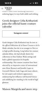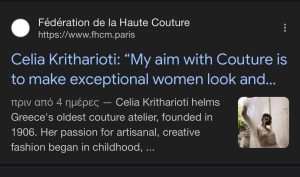 - Η επίδειξη, που πραγματοποιήθηκε στο πλαίσιο της Haute Couture Fashion Week, προκάλεσε έντονη δημοσιογραφική κινητικότητα όχι μόνο στον ελληνικό, αλλά και στον γαλλικό και διεθνή Τύπο, με δεκάδες αναφορές σε κορυφαία μέσα μόδας και lifestyle.