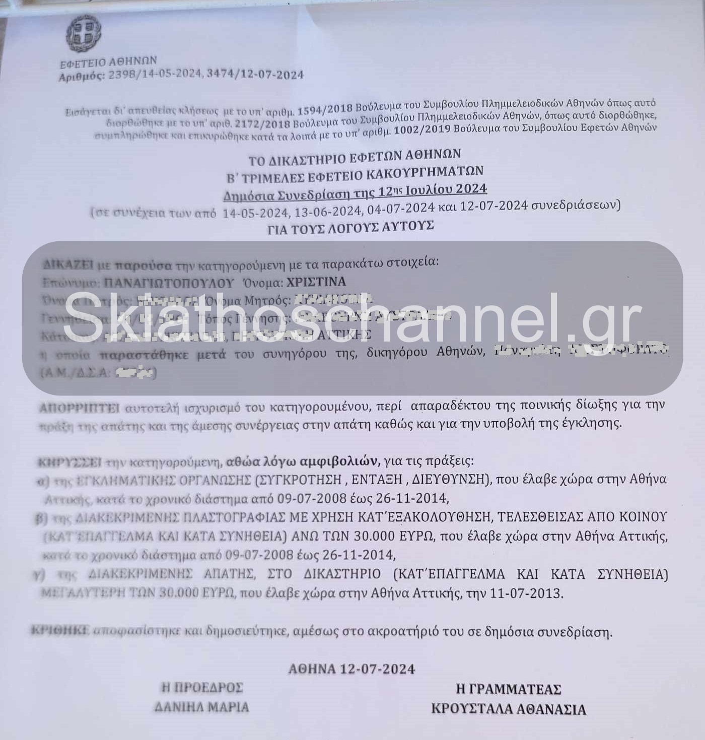 Το Skiathoschannel φέρνει στο φως της δημοσιότητας αποκλειστικά την αθωωτική απόφαση της Χριστίνας Παναγιωτοπούλου με ημερομηνία έκδοσης την Παρασκευή 12 Ιουλίου 2024 από το Β’ Τριμελές Εφετείο Κακουργημάτων.