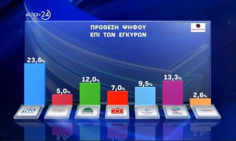 Την πρωτιά διατηρεί το κόμμα της Νέας Δημοκρατίας ως προς την πρόθεση ψήφου στη δημοσκόπηση της Opinion για λογαριασμό του τηλεοπτικού σταθμού Action24. Ακολουθεί το κόμμα της Πλεύσης Ελευθερίας, ενώ το ΠΑΣΟΚ βρίσκεται στην τρίτη θέση.