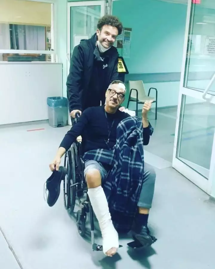 Όπως θα δεις, απεικονίζεται σε αναπηρικό αμαξίδιο με δεμένο το πόδι του και επίδεσμό στο κεφάλι. Στο πλευρό του ένας φίλος του, ο οποίος τον βοήθησε στις δύσκολες στιγμές.