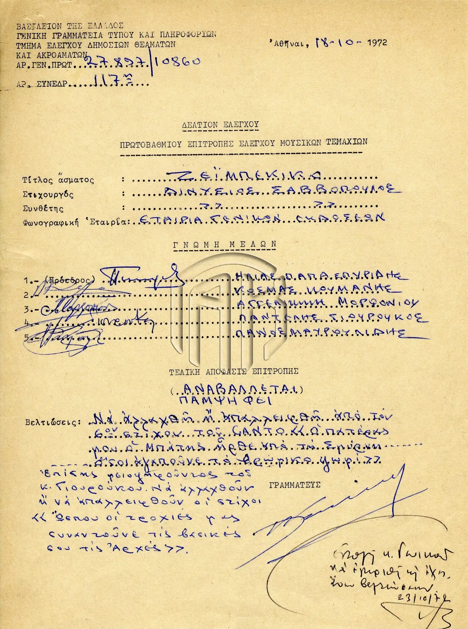 Τα Γενικά Αρχεία του Κράτους δημοσίευσαν κάποια έγγραφα από τη δεκαετία του 1970 και συγκεκριμένα από το 1972 όταν το τραγούδι του Διονύση Σαββόπουλου απορρίφθηκε από την Πρωτοβάθμια Επιτροπή Ελέγχου Μουσικών Τεμαχίων της Γενικής Γραμματείας Τύπου και Πληροφοριών που υπήρχε τότε.