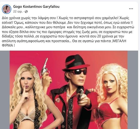 Η τραγουδίστρια γράφει «Δύο χρόνια χωρίς την λάμψη σου ! Χωρίς το αστραφτερό σου χαμόγελο! Χωρίς εσένα!! Όμως, κάποιον που δεν θέλουμε ,δεν τον ξεχνάμε ποτέ, όπως εγώ εσένα !! Δάσκαλε μου, καλλιτεχνικέ μου πατέρα και δεύτερη οικογένεια μου. Σε ευχαριστώ που έζησα δίπλα σου τις πιο όμορφες στιγμές της ζωής μου, σε ευχαριστώ που με δίδαξες τόσα πολλά ,σε ευχαριστώ που ήμουνα κοντά σου 20 χρόνια με την απόλυτη αγάπη, αφοσίωση και προστασία… Θα σε αγαπώ για πάντα ,ΜΕΓΑΛΗ ΦΙΡΜΑ!”
