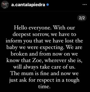 «Γεια σας, με βαθύτατη θλίψη σάς ενημερώνουμε ότι χάσαμε το μωρό που περιμέναμε. Είμαστε συντετριμμένοι, από εδώ και πέρα θα γνωρίζουμε ότι η Ζωή, όπου κι αν βρίσκεται θα μας προσέχει. Η μαμά είναι καλά και σας ζητάμε σεβασμό αυτή την δύσκολη στιγμή», έγραψε ο Ισπανός…