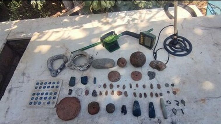 Πρόκειται για:(15) αρράβδωτους κίονες υστερορωμαικών– παλαιοχριστιανικών χρόνων, (3ος -4ος αι. μ.Χ.), ένα θραύσμα μαρμάρινου αντικειμένου με επεξεργασία, εννέα λίθινα βλήματα (πιθανόν καταπέλτη), μία λίθινη βάση κίονα, δύο τμήματα απολιθωμένων κορμών, ένα στόμιο πηγαδιού, δύο λίθινες λεκάνες, δύο πήλινα σφονδύλια, δύο τμήματα λίθινων εργαλείων –τριπτήρες νεολιθικής εποχής (6.500 π.Χ.-3.000 π.Χ.), μία μολύβδινη άγκυρα με οπή δεσίματος, πέντε τμήματα προϊστορικών λίθινων εργαλείων 4 πελέκεις και 1 σμίλη νεολιθικής εποχής (6.5000 π.Χ.-3.000 π.Χ.), ένα πώμα πίθου, ένα κεραμικό προϊστορικό αδιάγνωστο, με οπές ανάρτησης και διακόσμηση εγχάρακτη, ένα βλήμα σφενδόνης μολύβδινο, 25 λίθινα εργαλεία νεολιθικής εποχής 6.500 π.Χ.-3.000 π.Χ. [3 φολίδες και 22 λεπίδες], ένα λίθινο αδιάγνωστο ακόνι, δύο μεταλλικές σφαίρες (βλήματα κανονιού), μία χάλκινη αιχμή βέλους κλασσικών χρόνων 480 π.Χ.-323 π.Χ., ένα τμήμα χάλκινης πόρπης κλασσικών χρόνων 480 π.Χ.-323 π.Χ., ένα χάλκινο νόμισμα ίσως Ρωμαϊκών χρόνων 27 π.Χ-476 μ.Χ., ένα χάλκινο νόμισμα βυζαντινών χρόνων 330 μ.Χ-1453 μ.Χ. (φόλλις), ένα χάλκινο ενώτιο βυζαντινών χρόνων 330 μ.Χ-1453 μ.Χ., ένα λίθινο εργαλείο νεολιθικής εποχής 6.500 π.Χ.-3.000 π.Χ., ένα τμήμα αγγείου με λαβές, δύο νομίσματα οθωμανικής εποχής (1453 μ.Χ.-1922 μ.Χ.), ένα τμήμα περόνης με διακόσμηση οθωμανικής εποχής (1299 μ.Χ.-1922 μ.Χ.), ένα μεταλλικό δακτύλιο με διακόσμηση και ένα νεώτερο αντικείμενο – μεταλλικό τμήμα ζώνης.Ο συλληφθείς θα οδηγηθεί στον κ. Εισαγγελέα Πρωτοδικών Ροδόπης .