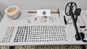 Στο σπίτι του 79χρονου, βρέθηκαν και κατασχέθηκαν ένας ανιχνευτής μετάλλων και 79 αρχαία αντικείμενα που εμπίπτουν στις προστατευτικές διατάξεις της σχετικής νομοθεσίας.