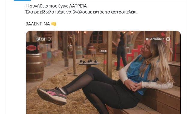 Και γι΄ αυτό την αποθεώνουν «Με μάλλινο φόρεμα και ζακέτα παίζει στην μονομαχία το είδωλο, τι να της πούνε» «Κάθε ριάλιτι που σέβεται τον εαυτό του χρειάζεται το είδωλο του. Κι η Βαλεντίνα ανήκει σε αυτήν την κατηγορία.» «Η συνήθεια που έγινε ΛΑΤΡΕΙΑ Έλα ρε είδωλο πάμε να βγάλουμε εκτός το αστροπελέκι.» γράφουν: