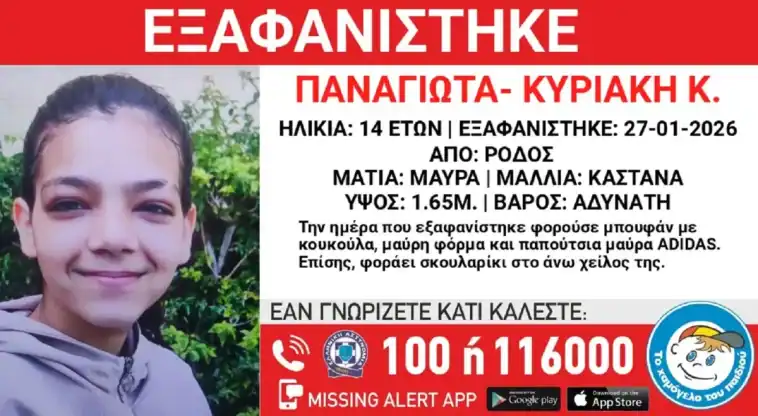 Η 14χρονη Παναγιώτα-Κυριακή εξαφανίστηκε το πρωί της Τρίτης (27/01/2026) από χώρο παιδικής προστασίας στη Ρόδο και το «Χαμόγελο του Παιδιού» ενημερώθηκε σήμερα και προχώρησε άμεσα στη δημοσιοποίηση των στοιχείων της καθώς ενδέχεται να συντρέχουν λόγοι οι οποίοι θέτουν τη ζωή της σε κίνδυνο.