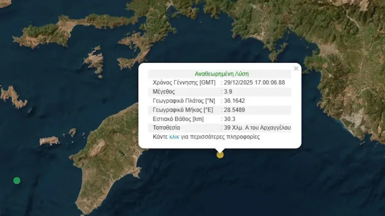 Ισχυρός σεισμός μεγέθους 3,9 Ρίχτερ σημειώθηκε το βράδυ της Δευτέρας (29.12.2025) στο νησί της Ρόδου.