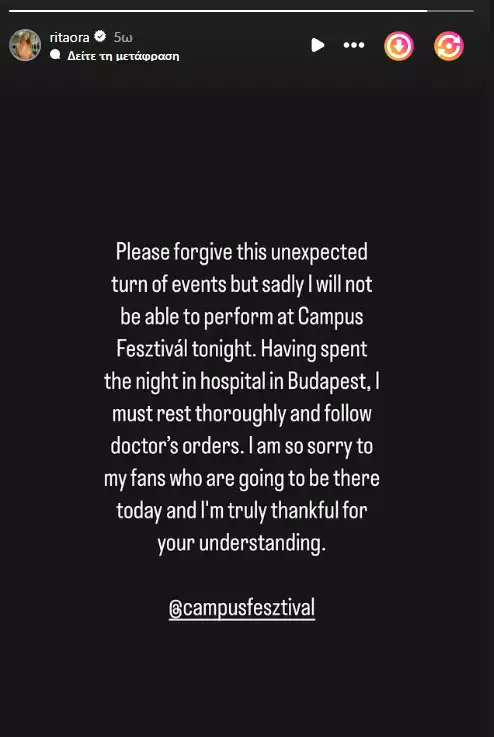 «Παρακαλώ συγχωρήστε αυτή την απροσδόκητη εξέλιξη, αλλά δυστυχώς δεν θα μπορέσω να εμφανιστώ στο Campus Fesztivál απόψε. Έχοντας περάσει τη νύχτα στο νοσοκομείο της Βουδαπέστης, πρέπει να ξεκουραστώ καλά και να ακολουθήσω τις οδηγίες του γιατρού», γράφει στο ποστ.