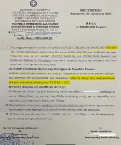 - «Σχετικά με τη διάθεση αστυνομικών για την προστασία υποψηφίου προέδρου κόμματος (σ.σ.: εννοεί τον υποψήφιο πρόεδρο του ΣΥΡΙΖΑ Στέφανο Κασσελάκη), από το Αρχηγείο της Ελληνικής Αστυνομίας διευκρινίζονται τα ακόλουθα: Ο συγκεκριμένος υποψήφιος αιτήθηκε τη φύλαξη του ιδίου, καθώς και προσώπου του περιβάλλοντός του.Το αίτημα διαβιβάστηκε στις αρμόδιες υπηρεσίες. Για τη διαχείριση του αιτήματος και τη διάθεση των αστυνομικών δυνάμεων ακολουθήθηκε η προβλεπόμενη διαδικασία από τις αρμόδιες υπηρεσίες.Κατόπιν δημόσιας τοποθέτησης για τη μη διάθεση του εν λόγω αστυνομικού προσωπικού η αστυνομική δύναμη που είχε διατεθεί θα αποσυρθεί».