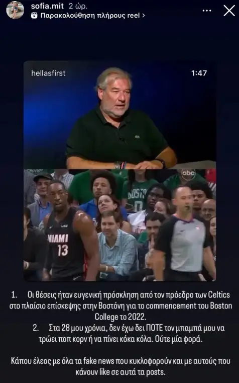 Απάντησε έδωσε η 28χρονη κόρη του πρωθυπουργού, η Σοφία Μητσοτάκη καταρρίπτει τους ισχυρισμούς που διατύπωσε στα social media ο σύμβουλος επικοινωνίας και πρώην πολιτικός, Νίκος Καραχάλιος σχετικά με την επίσκεψη του Κυριάκου Μητσοτάκη σε αγώνα των Boston Celtics στο NBA, το 2022.