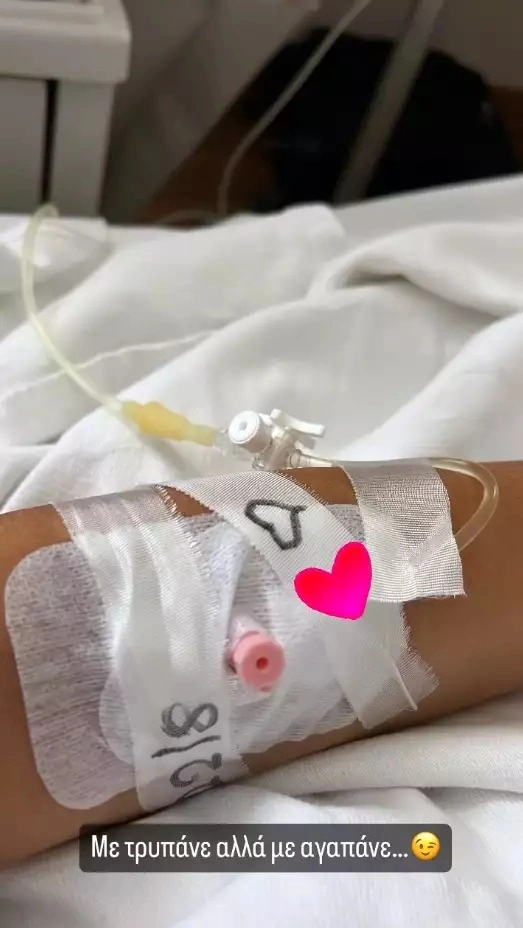 Δείχνοντας το χέρι της με τον ορό, έγραψε «με τρυπάνε αλλά με αγαπάνε».