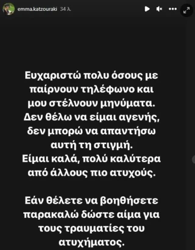 «Ευχαριστώ πολύ όσους με παίρνουν τηλέφωνο και μου στέλνουν μηνύματα. Δεν θέλω να είμαι αγενής, δεν μπορώ να απαντήσω αυτή τη στιγμή. Είμαι καλά, πολύ καλύτερα από άλλους πιο άτυχους. Εάν θέλετε να βοηθήσετε, παρακαλώ δώστε αίμα για τους τραυματίες του ατυχήματος», είχε γράψει τότε η Εμμανουέλα Κατζουράκη.