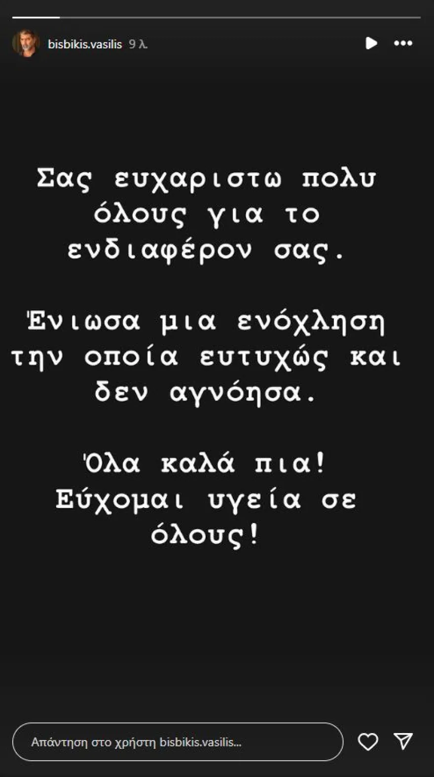 Ο Βασίλης Μπισμπίκης βρέθηκε σε ιδιωτική κλινική στην Αθήνα, μετά από καρδιακό επεισόδιο που υπέστη, ενώ υποβλήθηκε σε δύο επεμβάσεις. Σύμφωνα με ρεπορτάζ της εκπομπής «Πρωινό», ο ηθοποιός είχε κάποιους πόνους στο στήθος του, ενώ βρισκόταν στο σπίτι του με τη Δέσποινα Βανδή. Όταν την ενημέρωσε για αυτό, εκείνη τον μετέφερε αμέσως στο νοσοκομείο, όπου και εισήχθη αμέσως. Κατά τη διάρκεια της νοσηλείας του, ο Βασίλης Μπισμπίκης υπεβλήθη σε τοποθέτηση stent, αφού παρατηρήθηκε πρόβλημα με τις αρτηρίες του. Σε νέα του ανάρτηση στον προσωπικό του λογαριασμό στο Instagram, ο Βασίλης Μπισμπίκης ευχαρίστησε το κοινό για το ενδιαφέρον του κι ενημέρωσε για την κατάσταση της υγείας του. «Σας ευχαριστώ πολύ όλους για το ενδιαφέρον σας. Ένιωσα μια ενόχληση, την οποία ευτυχώς και δεν αγνόησα. Όλα καλά πια! Εύχομαι υγεία σε όλους!», έγραψε σε story του στον προσωπικό του λογαριασμό στο Instagram.