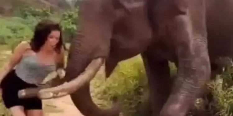 Ο ελέφαντας -προφανώς- δεν βρήκε διασκεδαστικό το παιχνίδι της τουρίστριας και άρχισε να εκνευρίζεται.
