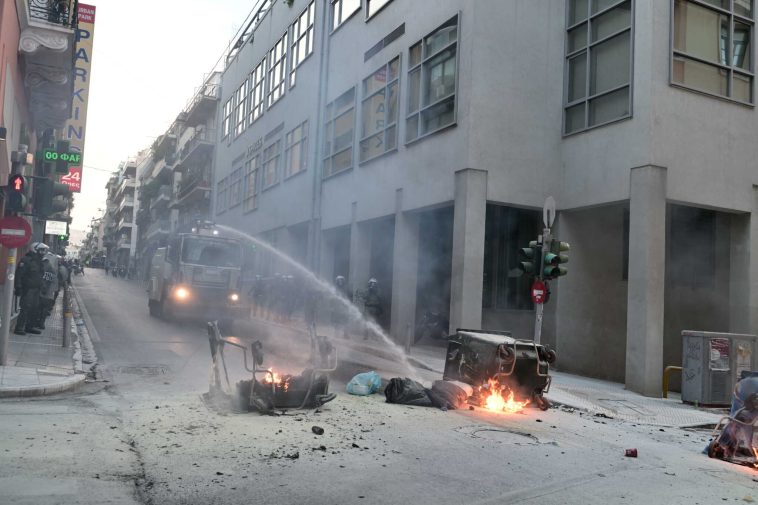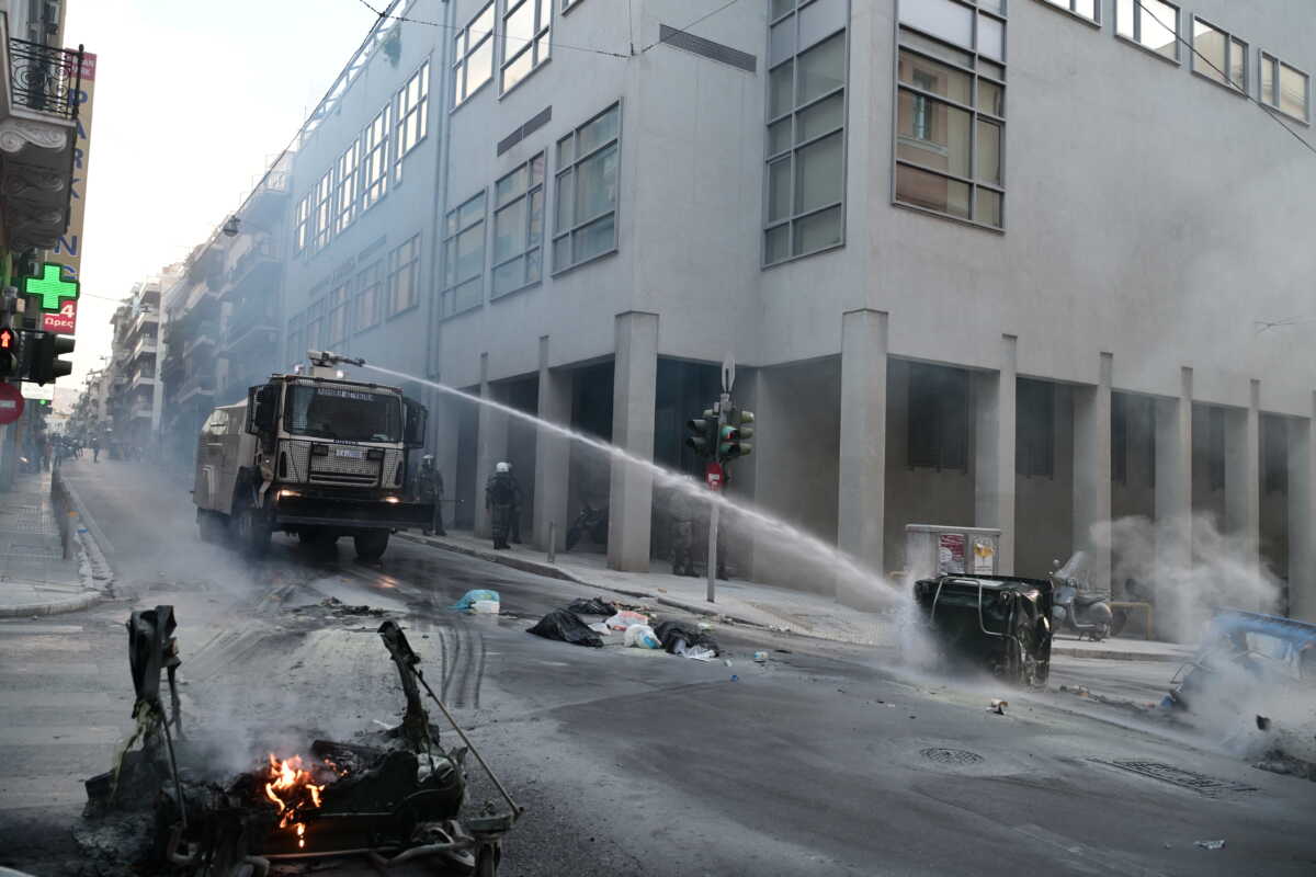 Τα επεισόδια συνεχίζονται με τους κουκουλοφόρους να προκαλούν φθορές και να οπλίζονται με πέτρες τις οποίες ρίχνουν εναντίον των αστυνομικών.