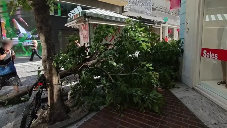 Από τύχη δεν τραυματίστηκε κανένας περαστικός στην Ερμού. Λόγω των ισχυρών ανέμων που πνέουν στην Αθήνα, ένα μεγάλο δέντρο έσπασε και έπεσε με δύναμη στο έδαφος.