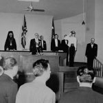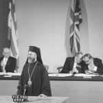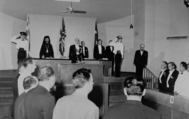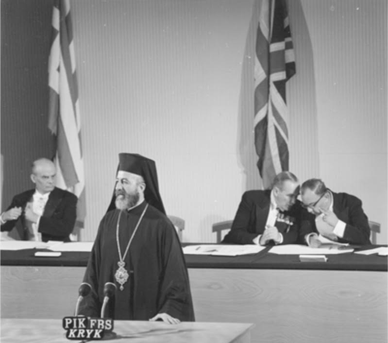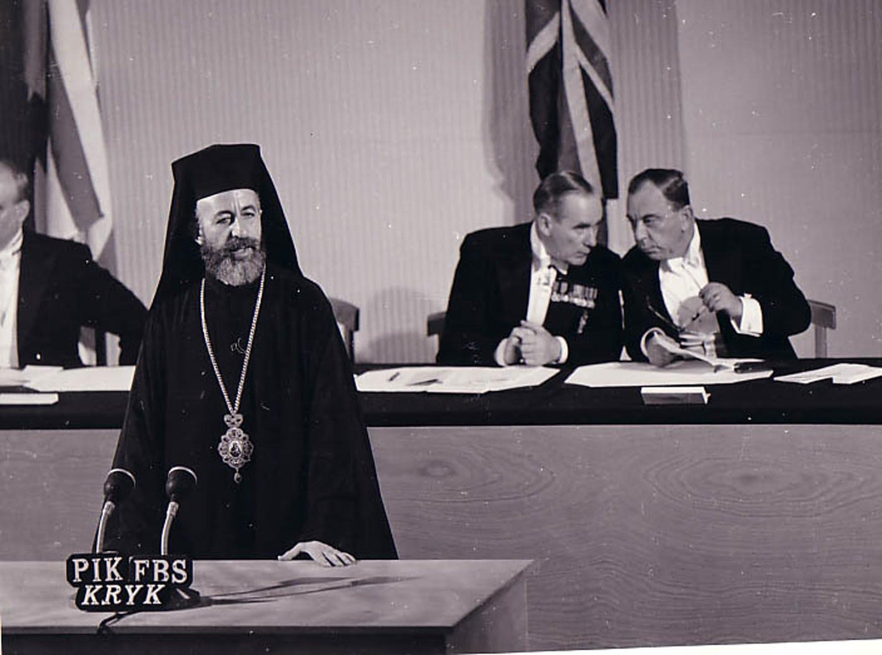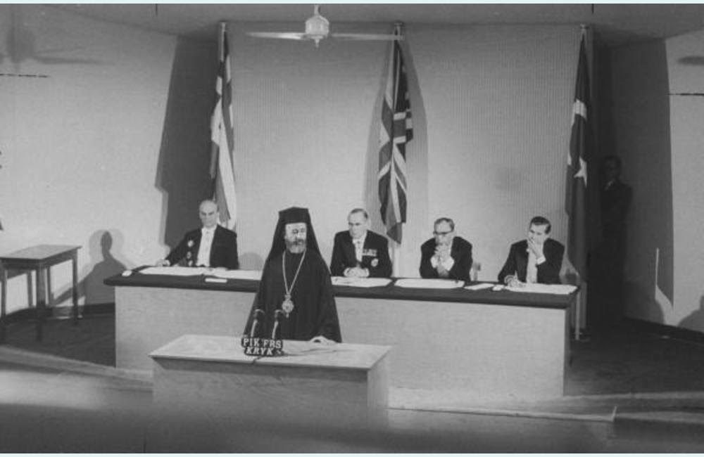 Σε αυτήν, εικονίζεται να εκφωνεί ομιλία σχετική με την περίσταση ο μελλοντικός πρώτος Πρόεδρος Αρχιεπίσκοπος Μακάριος ο Γ’, ενώ πίσω του ο μέχρι τότε Βρετανός Κυβερνήτης Σερ Χιου Φουτ ψιθυρίζει κάτι στον μελλοντικό Αντιπρόεδρο Φαζίλ Κιουτσούκ, με δύο σημαίες να υπάρχουν στον χώρο: Μια ελληνική και μια αγγλική.