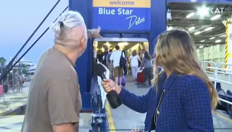 Στο λιμάνι του Πειραιά βρέθηκε η δημοσιογράφος του ΣΚΑΙ, Βάσια Γκανάρα, για να συνομιλήσει με τους τελευταίους ταξιδιώτες που φεύγουν την ημέρα του Δεκαπενταύγουστου για τα πανέμορφα ελληνικά νησιά. Λίγο πριν το τέλος της σύνδεσης συνάντησε έναν κύριο, που αποχαιρετούσε τον φίλο του, ο οποίος έφευγε με το πλοίο για Σαντορίνη. Ο ίδιος δεν επιβιβαζόταν σήμερα με τον φίλο του και έκανε χιούμορ στον αέρα.