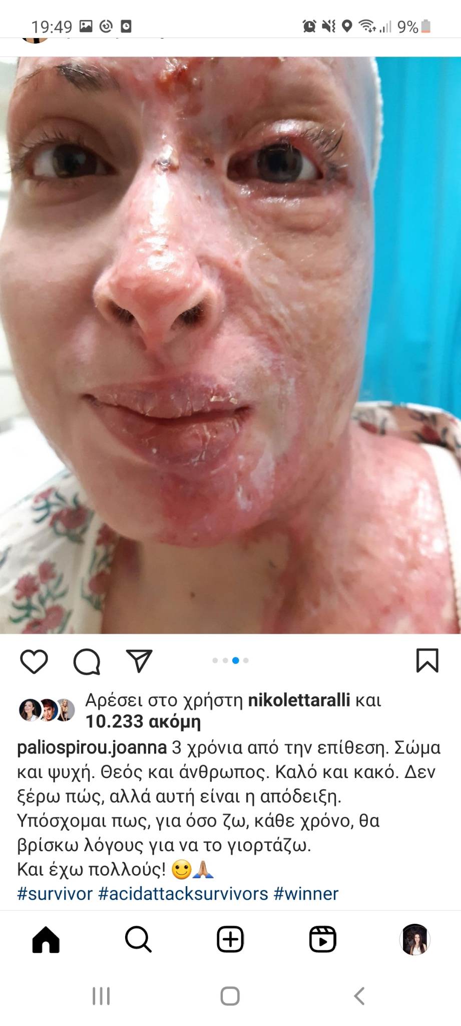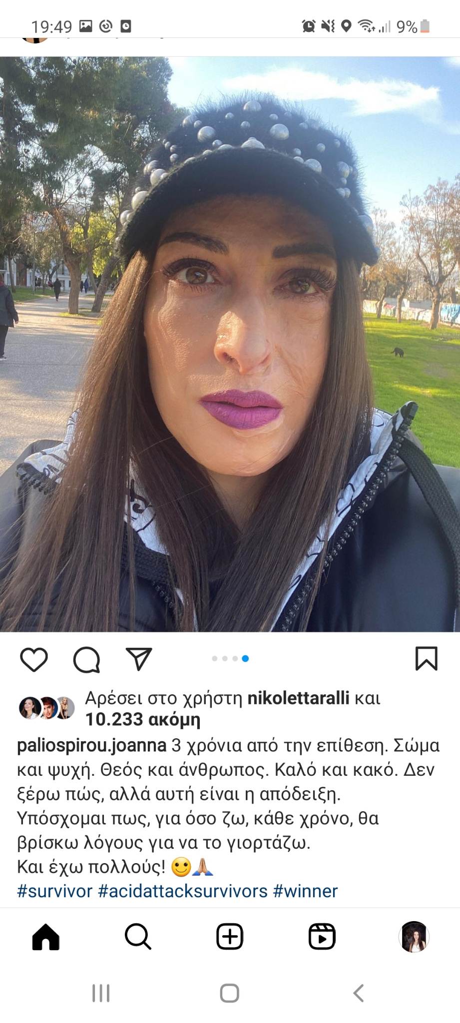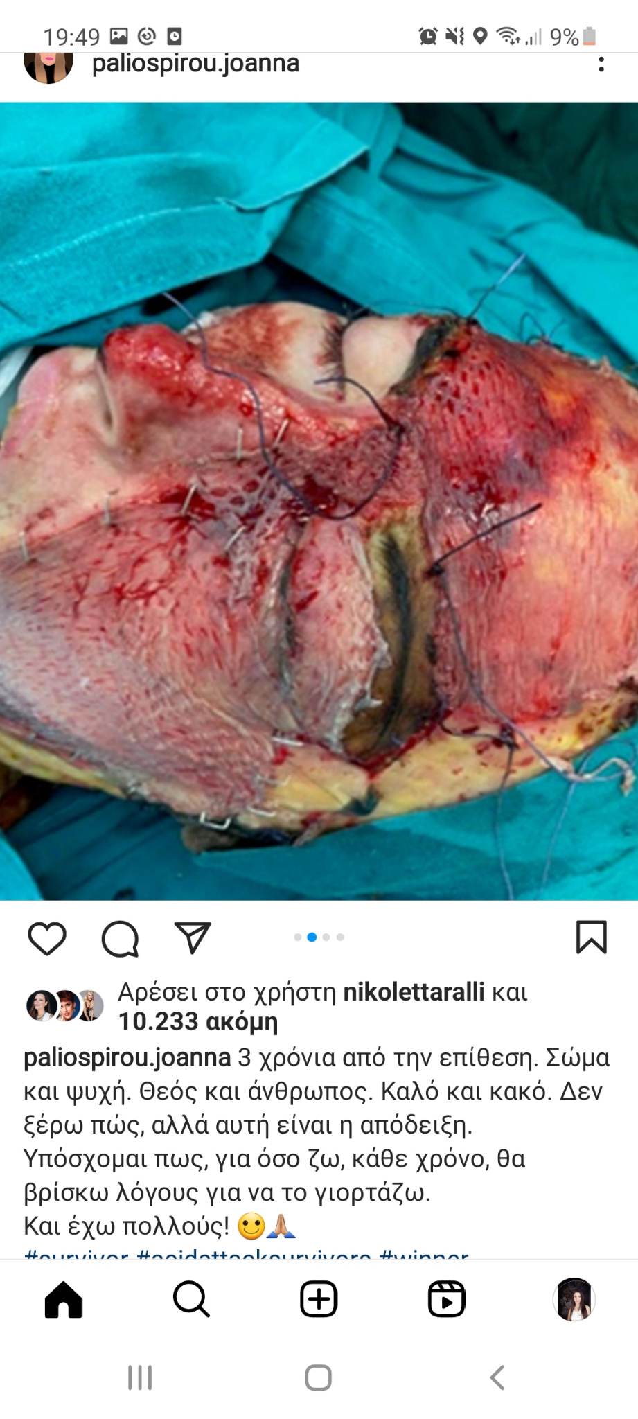 «3 χρόνια από την επίθεση. Σώμα και ψυχή. Θεός και άνθρωπος. Καλό και κακό. Δεν ξέρω πώς, αλλά αυτή είναι η απόδειξη. Υπόσχομαι πως, για όσο ζω, κάθε χρόνο, θα βρίσκω λόγους για να το γιορτάζω. Και έχω πολλούς!», έγραψε στην ανάρτησή της.