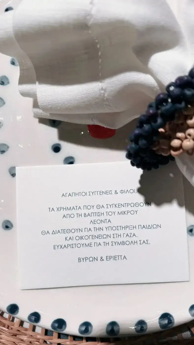 Το πρωί της Κυριακής (31/8) η Εριέττα Κούρκουλου μοιράστηκε τις πρώτες φωτογραφίες από τη βάφτιση του δεύτερου γιου της στα social media, τονίζοντας παράλληλα πως όσα χρήματα μαζεύτηκαν για τον μικρό νεοφώτιστο Λέοντα θα διατεθούν για ανθρωπιστική βοήθεια στην Γάζα.