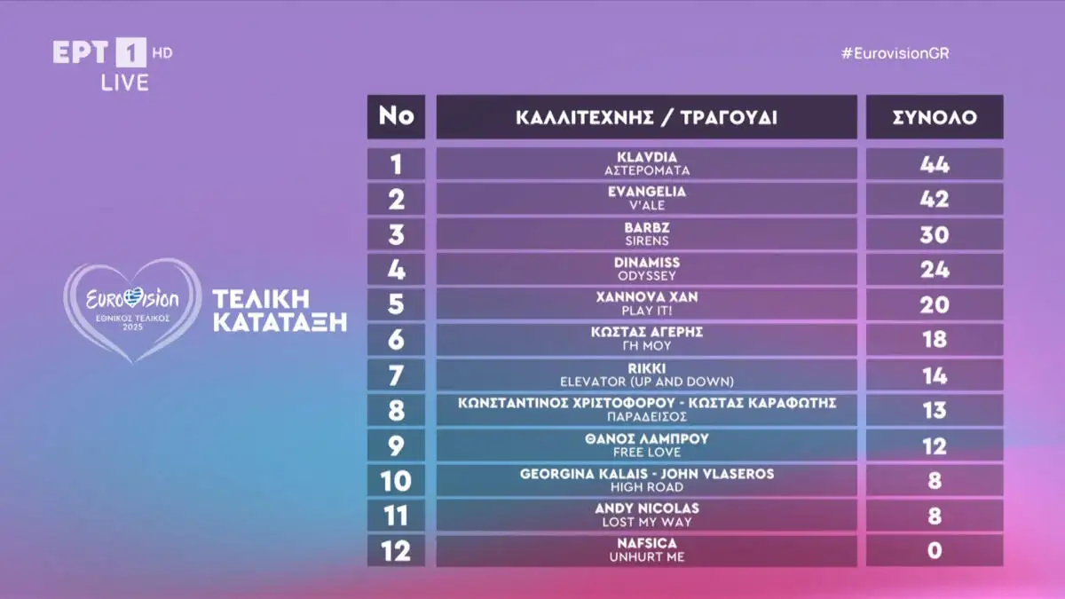 Με την Klavdia θα ταξιδέψει, τελικά, η Ελλάδα στην Eurovision 2025 τον ερχόμενο Μάιο στην Ελβετία. Αμέσως μετά την ολοκλήρωση του ελληνικού τελικού με οικοδεσπότες την Έλενα Παπαρίζου και τον Σάκη Ρουβά, ωστόσο, το τηλεοπτικό κοινό έμαθε την τελική κατάταξη των 12 τραγουδιών.