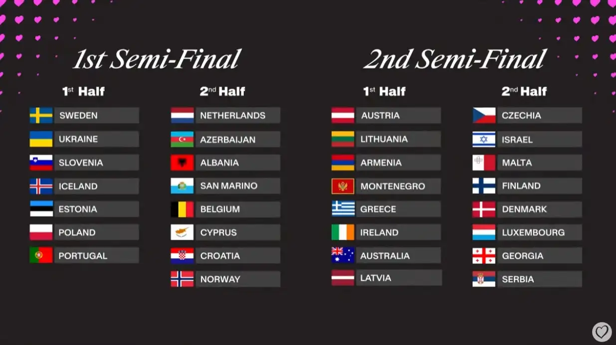 Αμέσως μετά, οι παρουσιαστές τράβηξαν έναν-έναν τους κλήρους με τα ονόματα των χωρών, τοποθετώντας τες στους δύο ημιτελικούς. Μετά την έκτακτη αποχώρηση της Μολδαβίας από τον διαγωνισμό, ο Α’ Ημιτελικός θα περιλαμβάνει 15 χώρες, ενώ ο Β’ 16.
