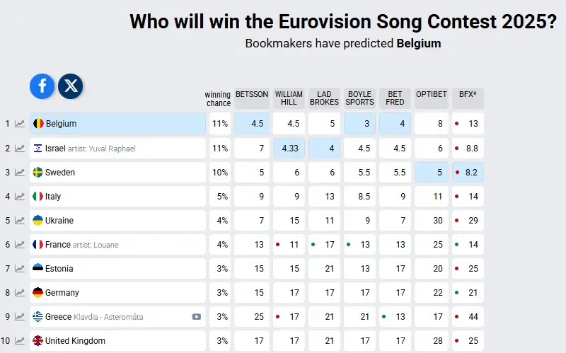 Μάλιστα, χαρακτηριστικό είναι το γεγονός ότι αμέσως μετά την ανακοίνωση της νίκης της Klavdia στον χθεσινό εθνικό μας τελικό, η Ελλάδα «σκαρφάλωσε» στην 9η θέση των στοιχημάτων, ανεβαίνοντας τρεις θέσεις ψηλότερα σε σχέση με τις προηγούμενες ημέρες. Βέβαια, αξίζει να σημειωθεί πως οι χώρες που συμπληρώνουν την πρώτη 10άδα δεν έχουν ανακοινώσει ακόμη το τραγούδι που θα τους εκπροσωπήσει. Απλώς υπάρχουν οι εθνικοί τελικοί που βρίσκονται σε διαδικασία διενέργειας ή έχουν ανακοινώσει μόνο τον καλλιτέχνη-εκπρόσωπό τους.