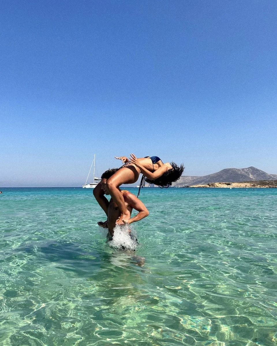 Η Ευγενία φαίνεται να κάθεται στους ώμους του Μιχαήλ και να ποζάρει χαμογελαστή, με φόντο τα καταγάλανα νερά της θάλασσας, ενώ στο επόμενο καρέ είναι η στιγμή που η ηθοποιός βουτάει στην θάλασσα.