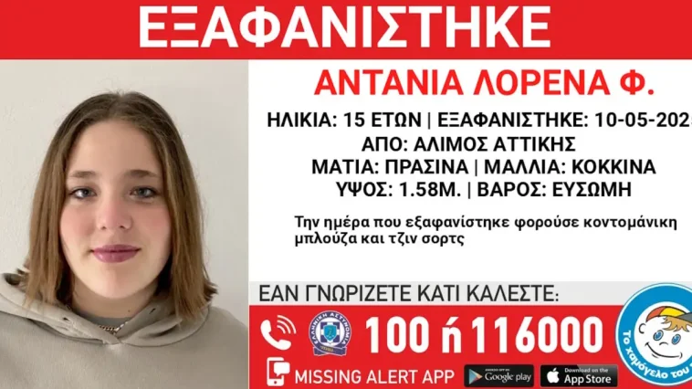 Συναγερμός σήμανε στον Άλιμο για την εξαφάνιση της Αντάνια – Λορένα Φ., 15 ετών. Σχετική ανακοίνωση έδωσε στη δημοσιότητα το «Χαμόγελο του Παιδιού» το απόγευμα της Τρίτης (13.05.2025).