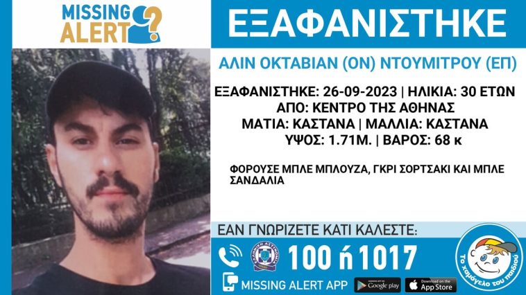Κινητοποίηση στο κέντρο της Αθήνας μετά την εξαφάνιση ενός 30χρονου άνδρα. Συγκεκριμένα, στις 26/9, εξαφανίστηκε από το Κέντρο της Αθήνας, ο Αλίν Οκταβιάν Ντουμίτρου, 30 ετών.