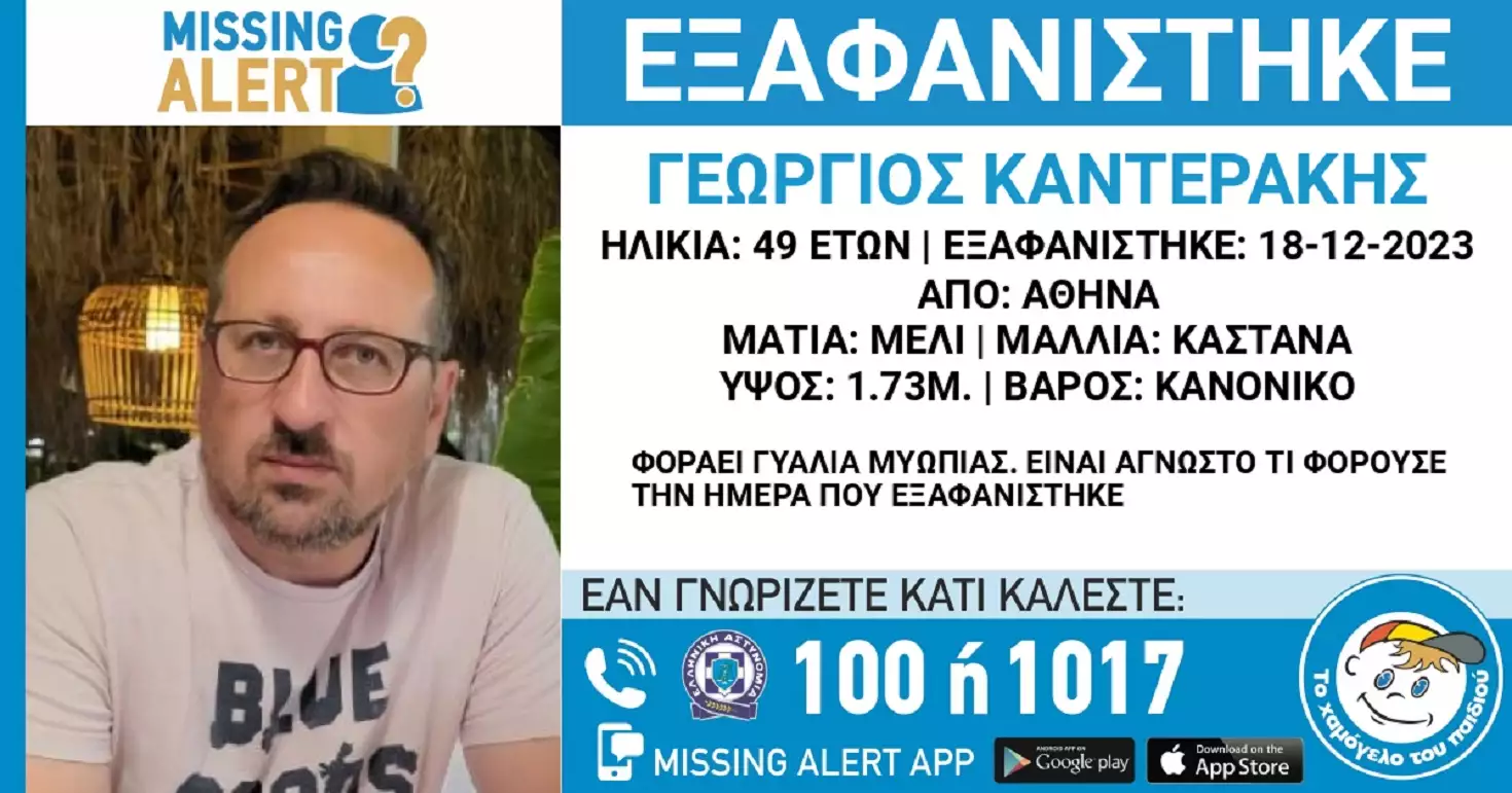 Ο Γιώργος Καντεράκης εξαφανίστηκε το πρωί της Δευτέρας (18/12/2023) και το «Χαμόγελο του Παιδιού» προχώρησε άμεσα, κατόπιν αιτήματος της οικογένειάς του, στη δημοσιοποίηση των στοιχείων του ενήλικου, καθώς ενδέχεται να συντρέχουν λόγοι, οι οποίοι θέτουν τη ζωή του σε κίνδυνο.