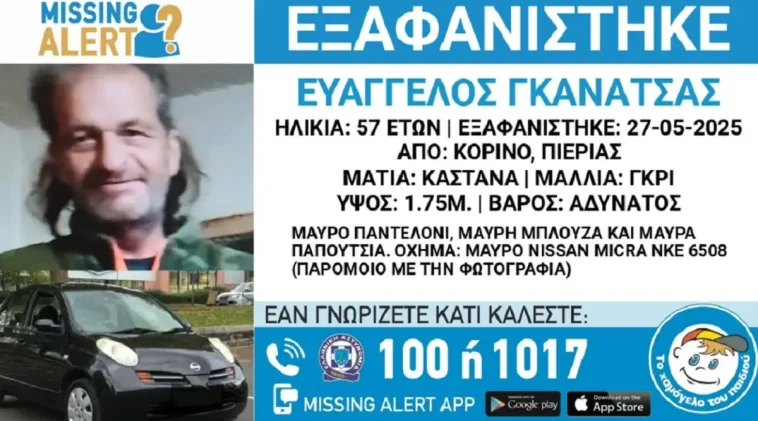 Εξαφανίστηκε το πρωί της Τρίτης (27/05/2025) στην περιοχή του Κορινού στην Πιερία ο 57χρονος Ευάγγελος Γκανάτσας, σύμφωνα με το «Χαμόγελο του Παιδιού».