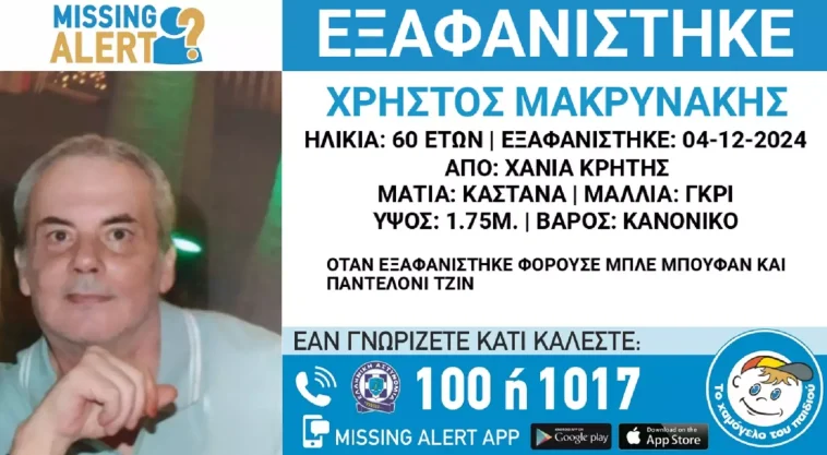Αγωνία στα Χανιά καθώς αγνοείται από τις 4 Δεκεμβρίου ο 60χρονος Χρήστος Μακρυνάκης, όπως ανακοίνωσε το «Χαμόγελο του Παιδιού».