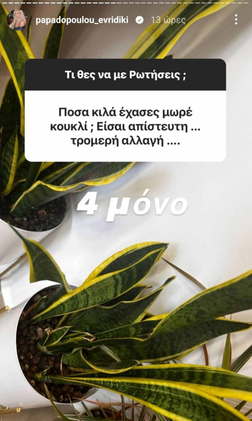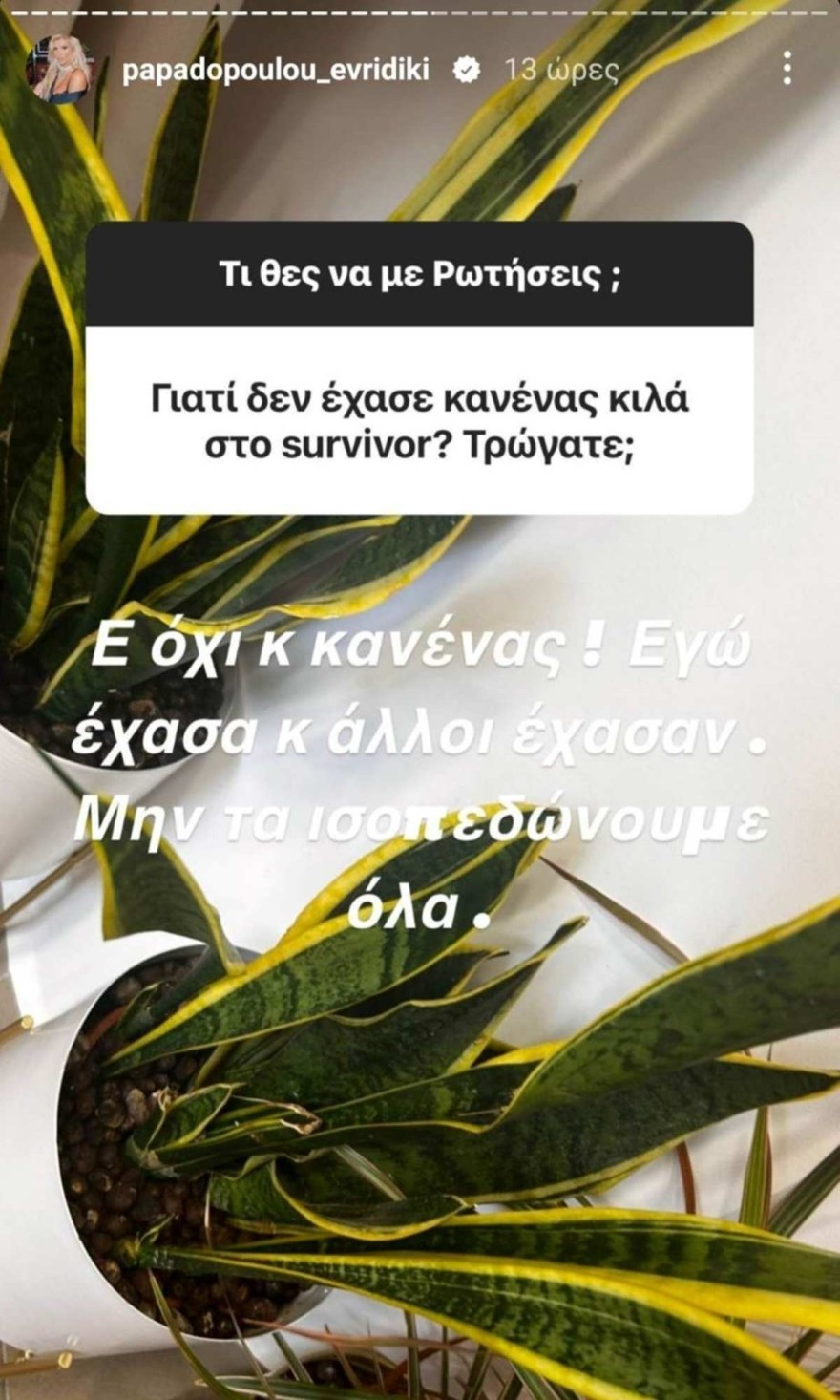 - Μάλιστα, όταν μία follower τη ρώτησε: «Γιατί δεν έχασε κανένας κιλά στο Survivor; Τρώγατε;», η πρώην παίκτρια του ριάλιτι επιβίωσης απάντησε φανερά ενοχλημένη: «Ε όχι και κανένας. Εγώ έχασα. Και άλλοι έχασαν. Μην τα ισοπεδώνουμε όλα», αποκαλύπτοντας σε επόμενο story πως έχασε 4 κιλά.