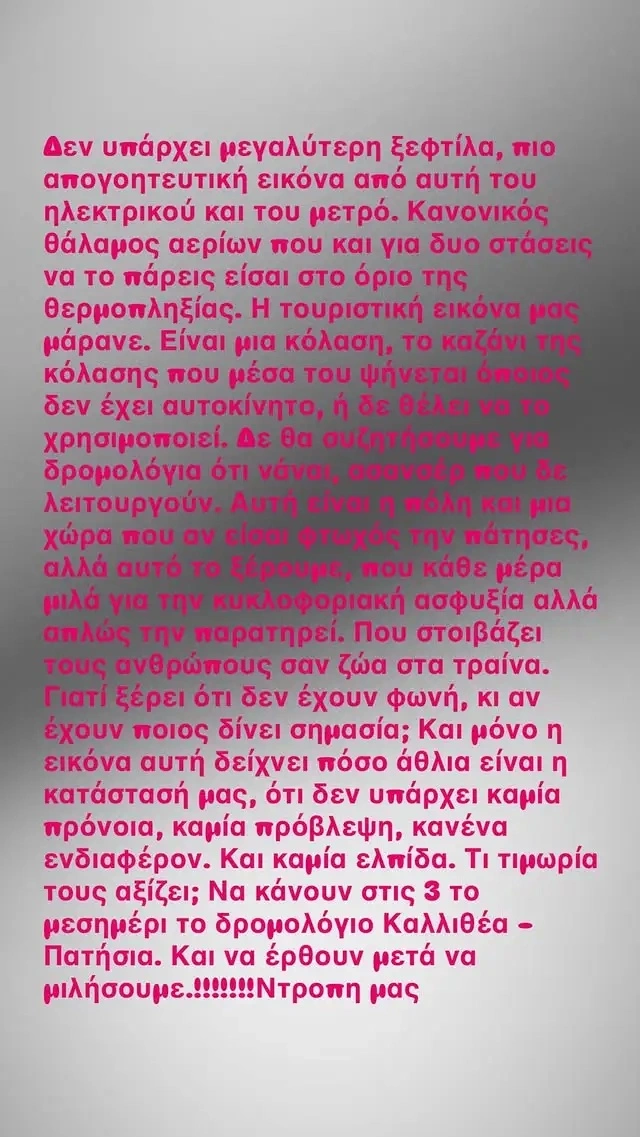 «Δεν υπάρχει μεγαλύτερη ξεφτίλα, πιο απογοητευτική εικόνα από αυτή του ηλεκτρικού και του μετρό. Κανονικός θάλαμος αερίων, που και για δύο στάσεις να το πάρεις είσαι στο όριο της θερμοπληξίας. Η τουριστική εικόνα μας μάρανε. Είναι μία κόλαση, το καζάνι της κόλασης που μέσα του ψήνεται όποιος δεν έχει αυτοκίνητο, ή δεν θέλει να το χρησιμοποιεί. Δεν θα συζητήσουμε για δρομολόγια ότι να ναι, ασανσέρ που δε λειτουργούν. Αυτή είναι η πόλη και μία χώρα που αν είσαι φτωχός την πάτησες, αλλά αυτό το ξέρουμε, που κάθε μέρα μιλάει για την κυκλοφοριακή ασφυξία αλλά απλώς την παρατηρεί. Που στοιβάζει τους ανθρώπους σαν ζώα στα τρένα.
