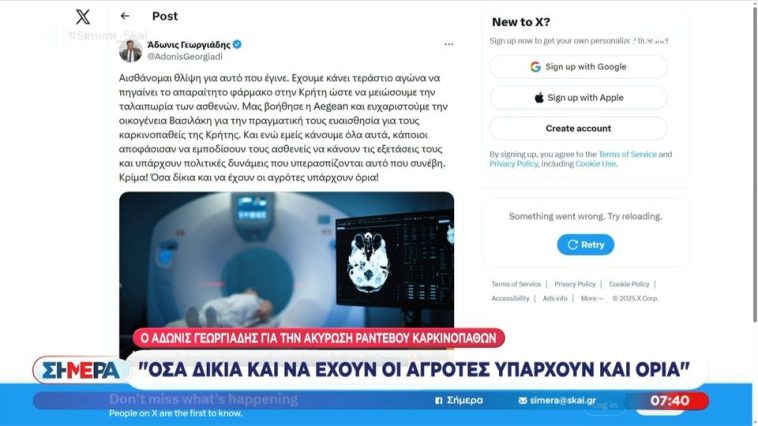 Με ανάρτησή του στο “Χ” ο υπουργός Υγείας Άδωνις Γεωργιάδης εξέφρασε τον εκνευρισμό και την λύπη του για την ακύρωση ραντεβού ογκολογικών ασθενών στο ΠΑΓΝΗ, η οποία προέκυψε επειδή η κατάληψη του αεροδρομίου από αγρότες εμπόδισε τη μεταφορά των απαραίτητων ραδιοφαρμάκων από την Αθήνα.