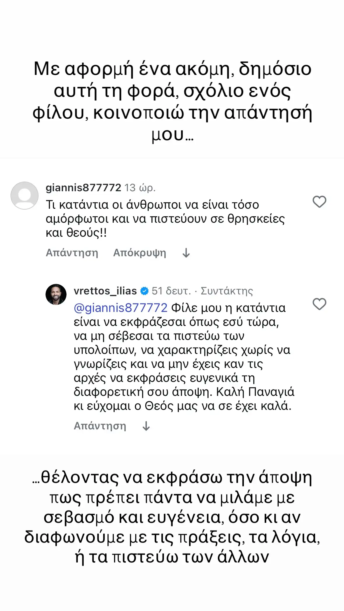 Ειδικότερα, κάποιος διαδικτυακός φίλος του δημοφιλούς τραγουδιστή έθιξε ευρύτερα τον τρόπο με τον οποίο πιστεύουν οι άνθρωποι στις θρησκείες με αποτέλεσμα εκείνος να του γράψει, αμέσως, μια απάντηση. Μάλιστα, λίγο αργότερα, ο Ηλίας Βρεττός δημοσίευσε μια ιστορία στον προσωπικό του λογαριασμό στο Instagram με τη στιχομυθία που είχε στην οποία και έκανε το εξής σχόλιο.