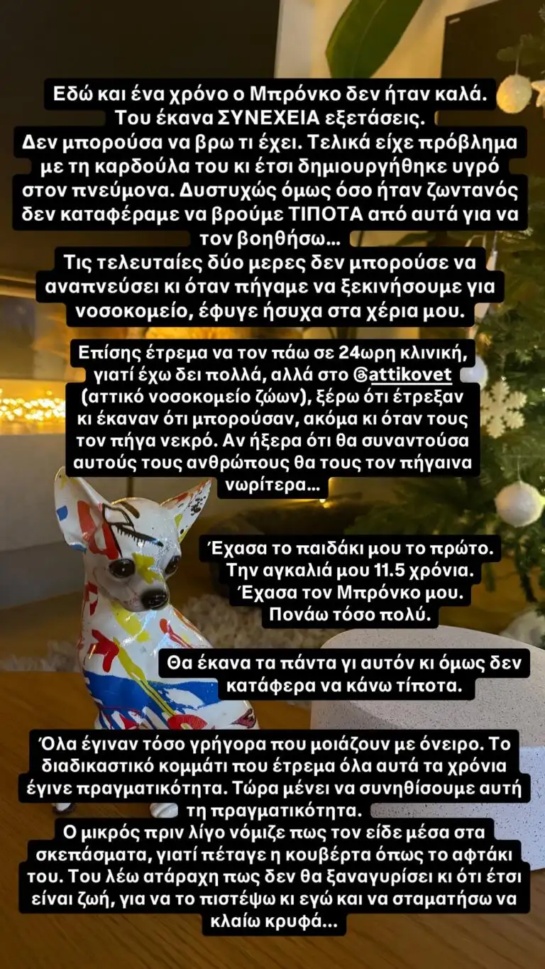 «Έχασα το παιδάκι μου το πρώτο. Την αγκαλιά μου 11,5 χρόνια. Έχασα τον Μπρόνκο μου. Πονάω τόσο πολύ. Θα έκανα τα πάντα για αυτόν κι όμως δεν κατάφερα να κάνω τίποτα» πρόσθεσε η Φελίσια Τσαλαπάτη σε αυτή την πολύ συγκινητική ιστορία την οποία και δημοσίευσε, πριν από λίγες ώρες, στον προσωπικό της λογαριασμό στο Instagram.