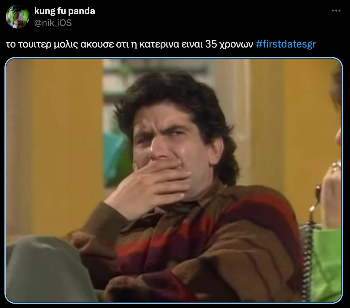 Το First Dates, το «τηλεοπτικό» διάσημο εστιατόριο, που άνοιξε τις πόρτες του και στην Ελλάδα, μετά από 19 χώρες όπου έχει λειτουργήσει και κερδίσει το ενδιαφέρον του κοινού, επέστρεψε, μέσα από την οθόνη του Star, ανανεωμένο, με μοναδικό σκοπό να δώσει ακόμα περισσότερες ευκαιρίες στην αγάπη! Στο επεισόδιο, η 35χρονη Κατερίνα πήγε στο παιχνίδι από τη Χαλκίδα και δήλωσε ερωτευμένη με τη ζωή και τις κόρες της, επιφυλακτική, όμως, στο να ερωτευτεί έναν άνδρα. Ο Αλεξάνδρος φλέρταρε και είπε πως του αρέσει να ρισκάρει στον έρωτα! Ωστόσο, κανείς δεν γνώριζε αν θα ήταν αυτός που θα καταφέρει να «ξεκλειδώσει» την καρδιά της Κατερίνας. Παρόλα αυτά, η παίκτρια, κατάφερε να γίνει viral στο Twitter, καθώς οι τηλεθεατές δεν μπορούσαν να αποδεχτούν ότι είναι 35 ετών.