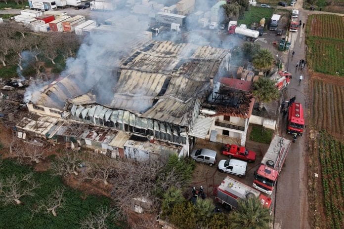 Σύμφωνα με την ΕΡΤ, η φωτιά ξέσπασε λίγο μετά τις 02:00 το πρωί, σε δύο αποθήκες εταιρείας, με τις φλόγες να έχουν κάψει το εσωτερικό τους.